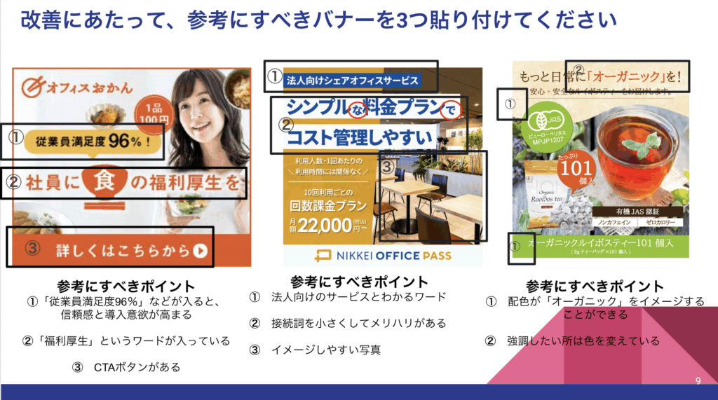 職業訓練の課題として福利厚生向けの広告バナー改善提案書を作成しました。