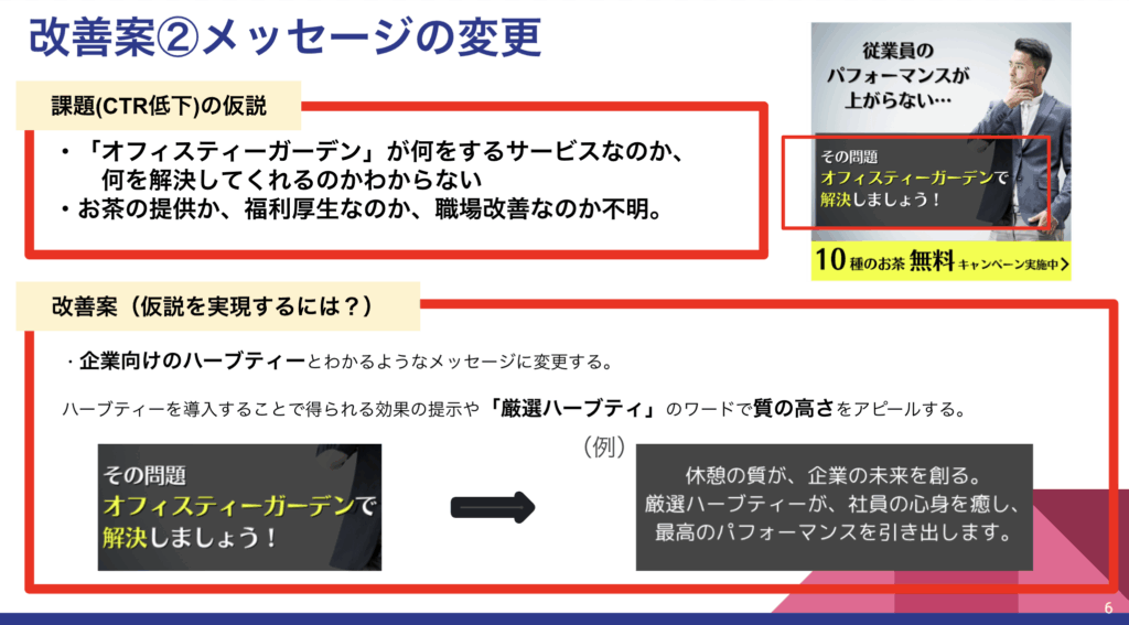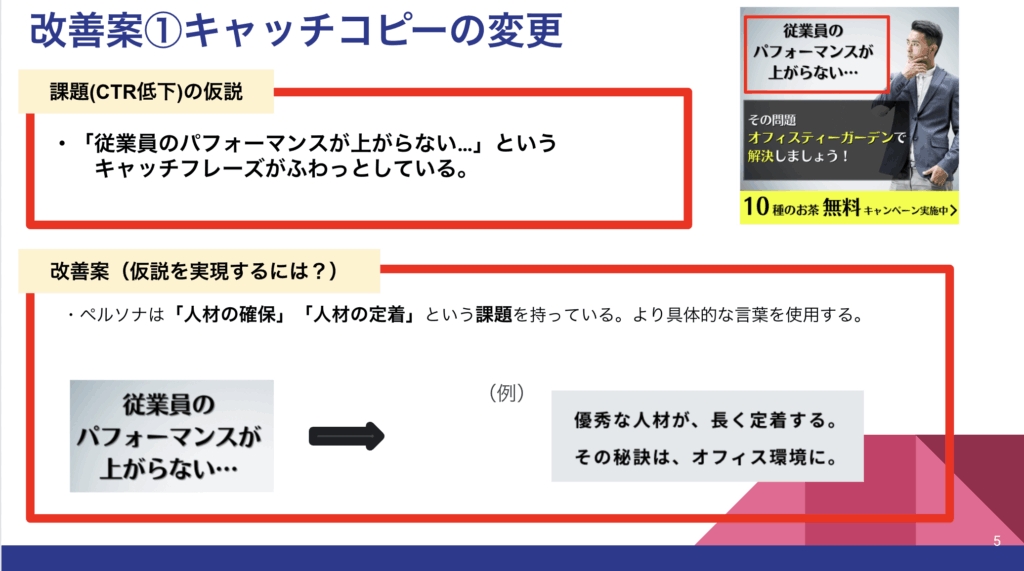 改善提案では、ペルソナの課題や興味に寄り添ったキャッチコピーと訴求内容の再設計を重視しました。