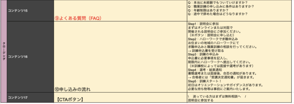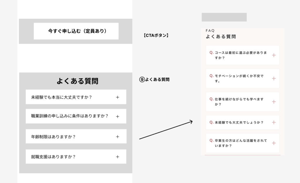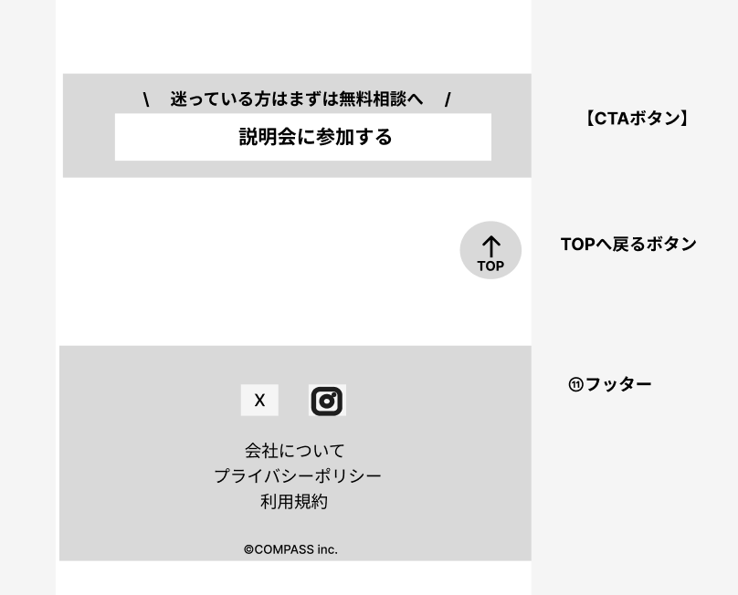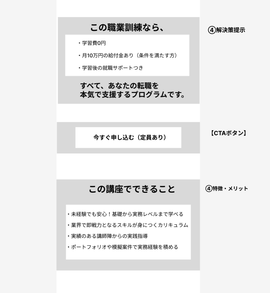 ファーストビュー直後、課題への共感・解決策提示後、申し込みの流れ説明後など、行動のきっかけを与えやすい場面にCTAを設置し、スムーズなコンバージョンを意識しました。